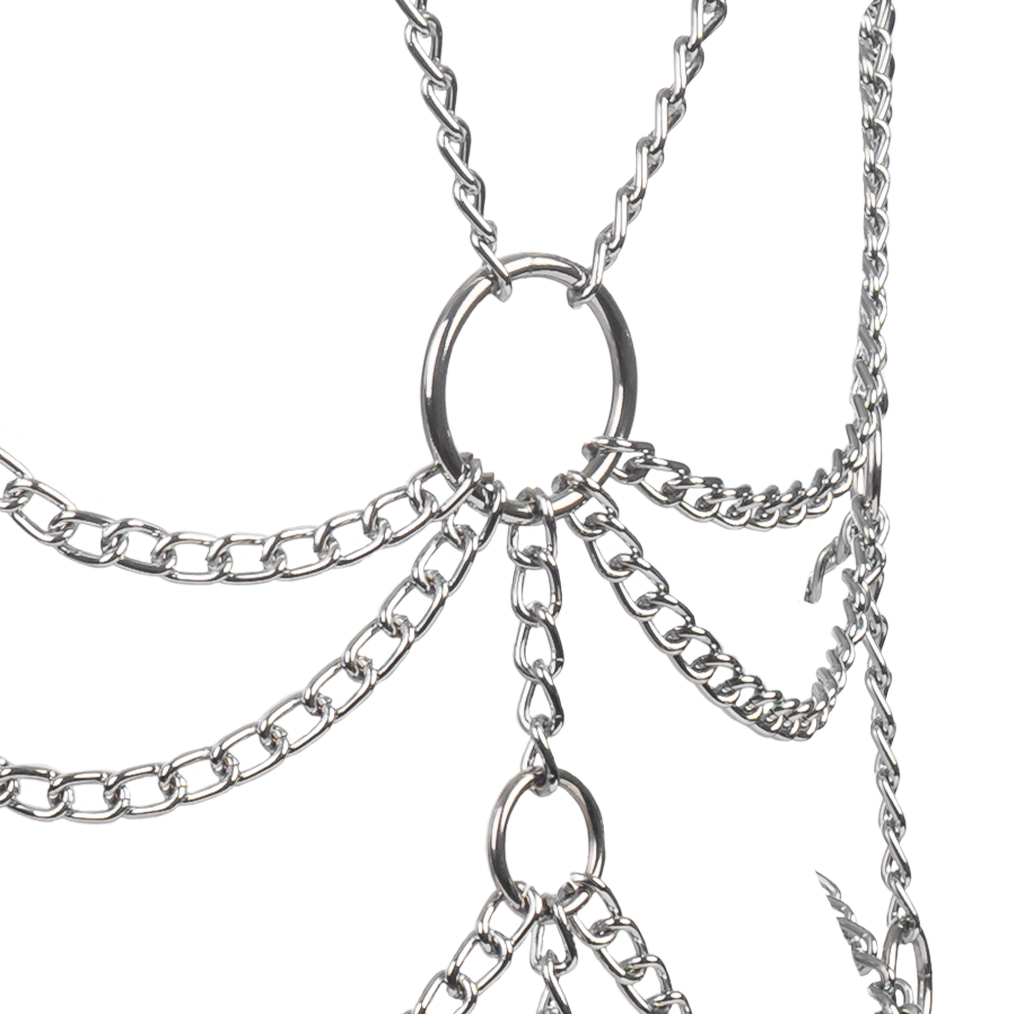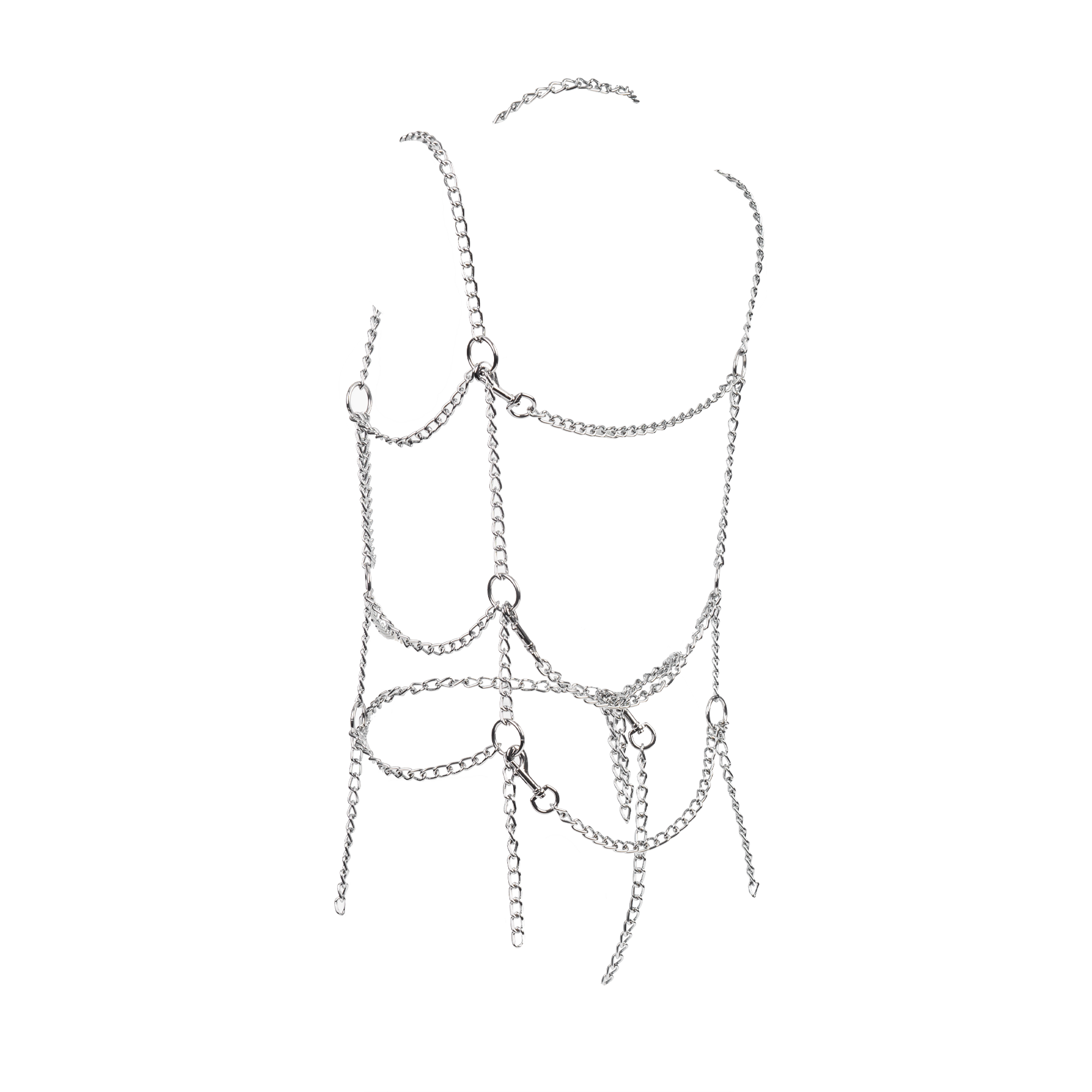 Dieser Kettenbody legt den Körper offen und zeigt dabei absolute Kontrolle. Die Metallglieder schmiegen sich an die Haut und führen den Blick entlang von Brüsten, Taille und Scham gehalten von großen Ringen und verbunden durch stabile Karabiner. Ob für Clubnächte, private Präsentationen oder Rollenspiele mit Besitzanspruch: dieser Body spricht Klartext.