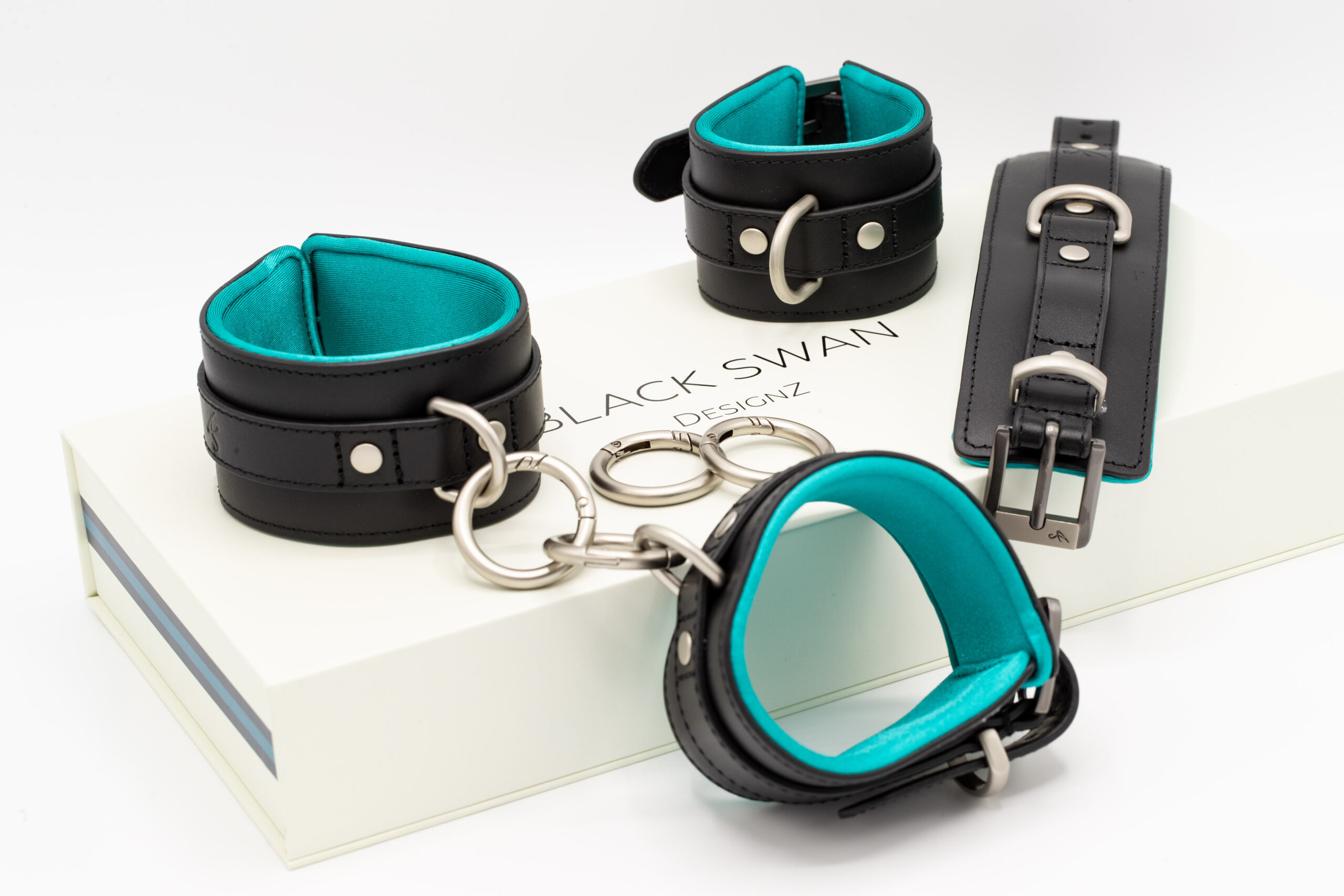 Das Black Swan FESSELSET „Black Ice“ setzt klare Kontrolle an Hand und Fuss an, ohne dass es an der Haut hart wirkt. Außen Leder, innen atmungsaktiver wasserabweisender Funktionsstoff, dazu Polsterung für spürbaren Komfort bei engem Sitz. Inklusive 4 Karabiner für schnelle Verbindungen im Bondage Setup.