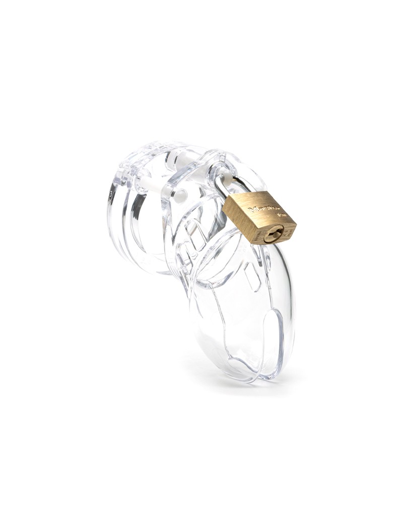 Transparenter Keuschheitskäfig aus stabilem Polycarbonat für langfristige Kontrolle und sicheren Tragekomfort. Mit fünf Ringen, Schloss und Reißverschlusstasche für diskrete Aufbewahrung.