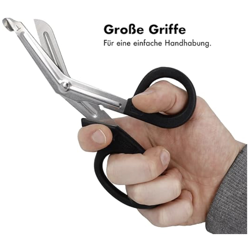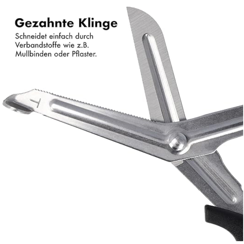 • Scharfe, gezahnte Klinge – Schneidet zuverlässig durch Verbandsmaterialien wie Mullbinden, Pflaster oder Stoff.