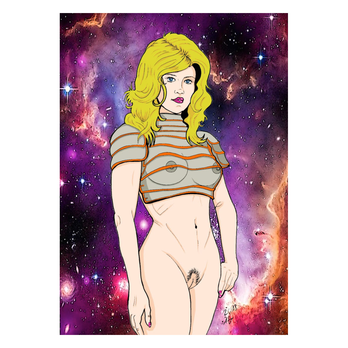 Der Druck zeigt eine blonde Frau mit durchscheinender futuristischer Panzerung vor einem kosmischen Hintergrund aus Licht, Nebel und Farbe. Der Körper ist kraftvoll und verletzlich zugleich, der Blick herausfordernd. Die Komposition betont Weiblichkeit und Dominanz, während das Spiel aus Linien und Raum Tiefe und Energie erzeugt.