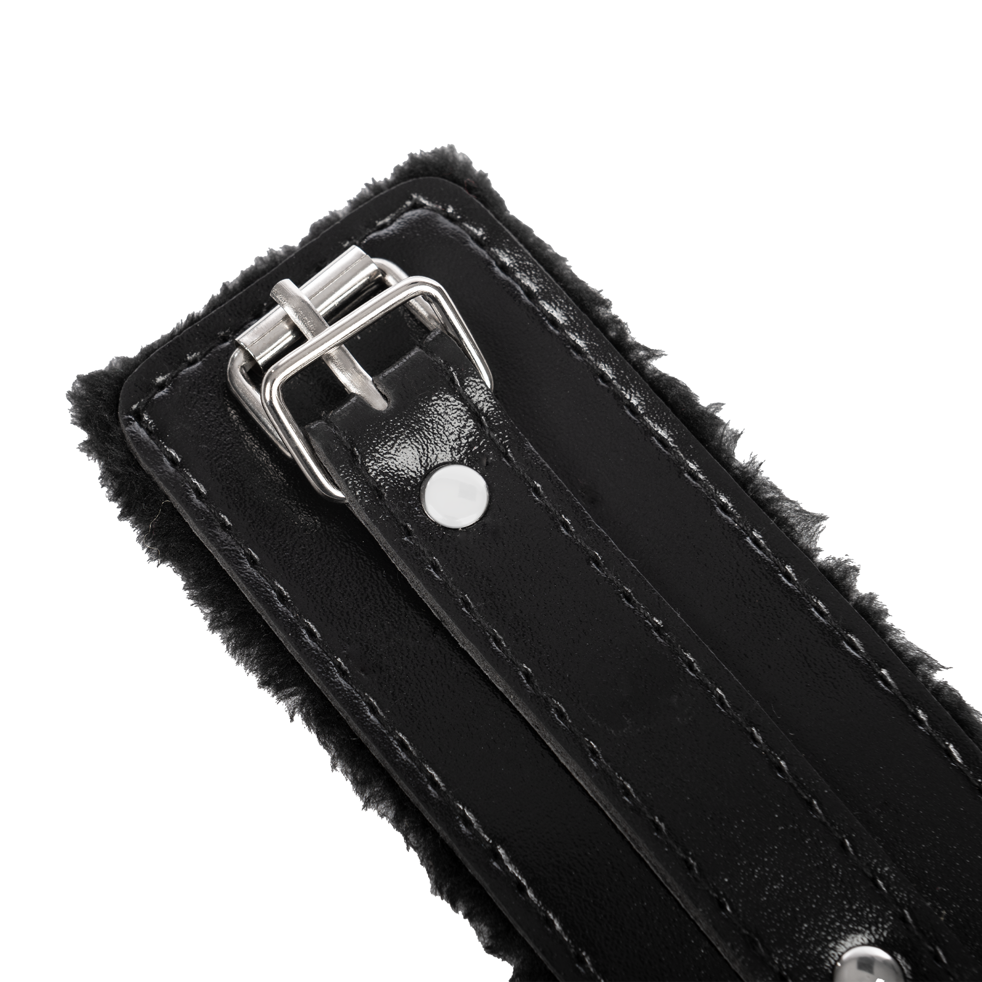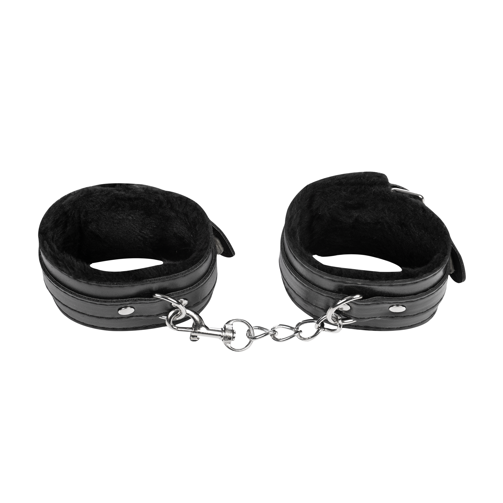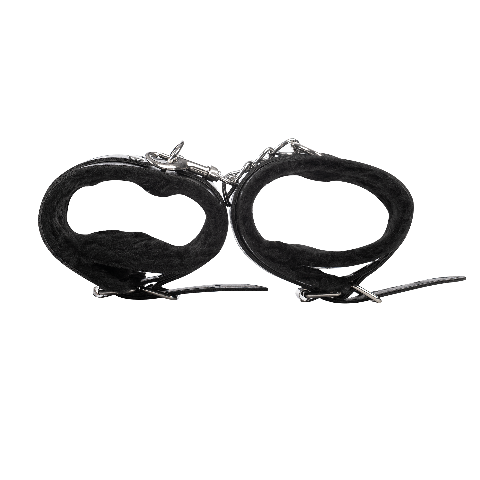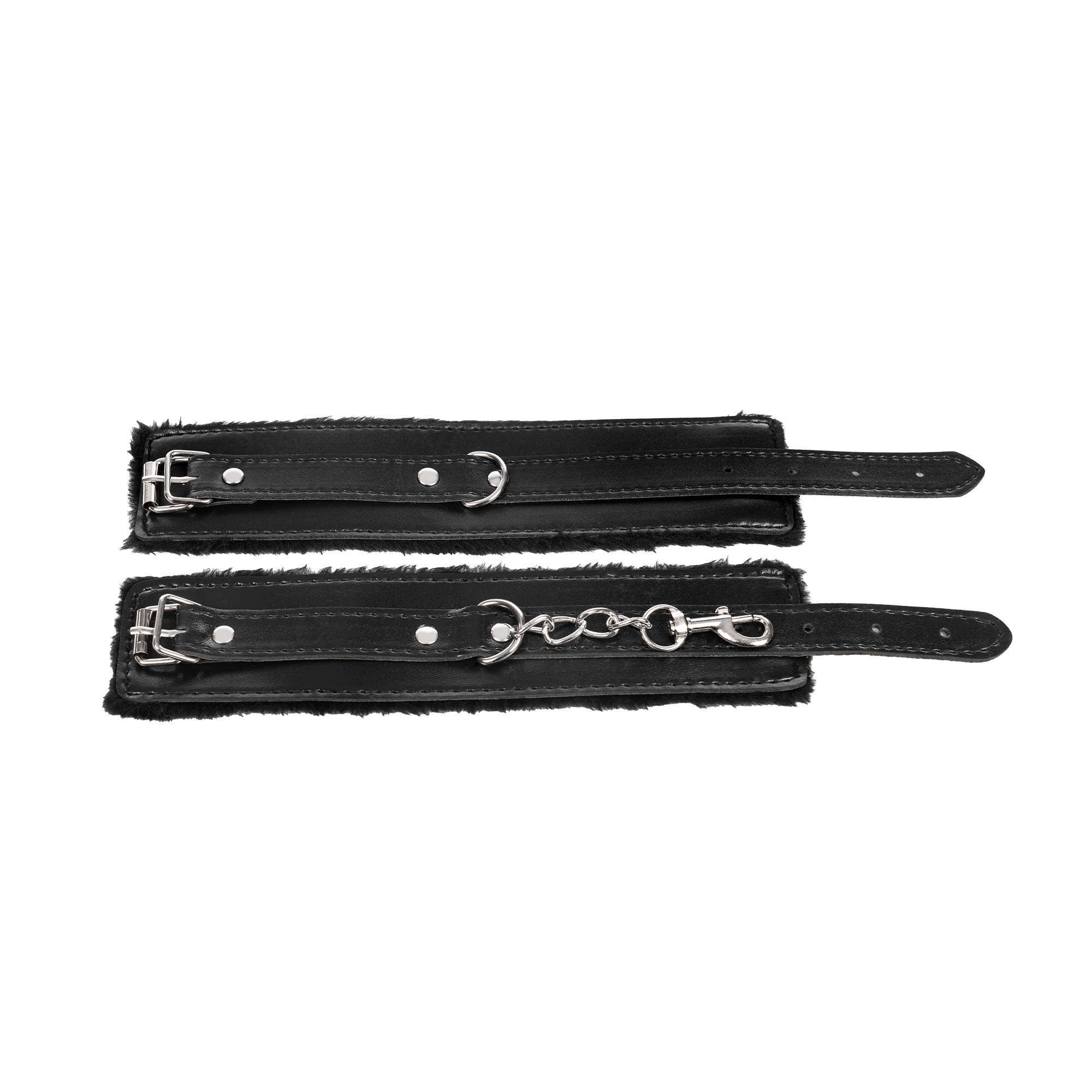 PU Oberfläche außen gibt Struktur und Kontrolle während innen dichtes Kunstfell für angenehmen Kontakt sorgt. Vier Verstellpositionen erlauben Anpassung an Handgelenke oder Knöchel und machen den Wechsel zwischen Hand und Fußfesseln fließend. Die Verbindungskette hält Distanz konstant und überträgt Impulse direkt.