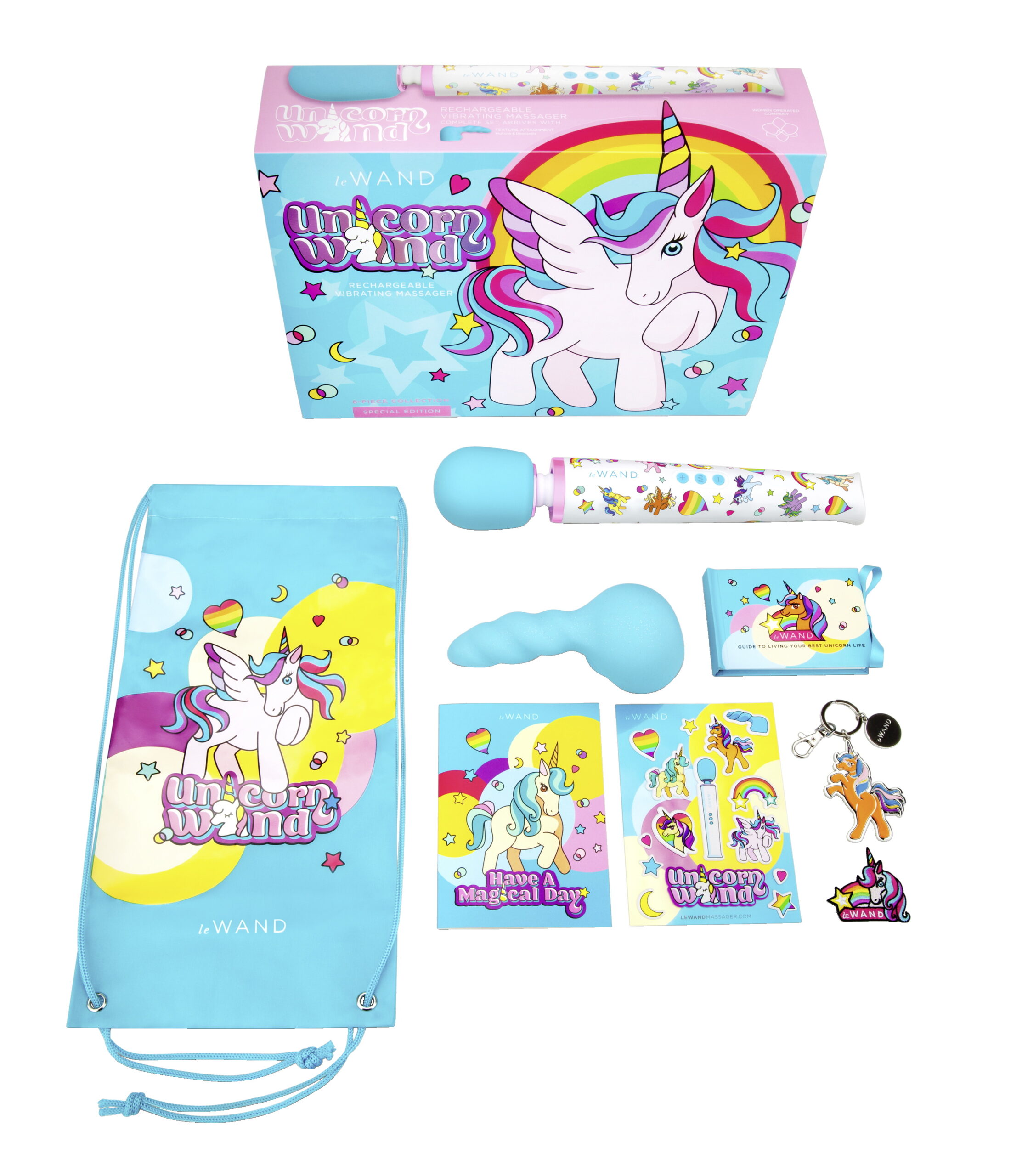Massagestab Unicorn Wand inklusive Einhorn-Dildoaufsatz und Aufbewahrungs-/Reisebeutel sowie Postkarte, Schlüsselanhänger, Aufnäher und Aufkleber mit Regenbogen- und Einhorn-Motiven. Ebenfalls inklusive: Netzstecker-Ladekabel mit 4 verschiedenen Steckdosenadaptern, sodass der Massagestab weltweit (z. B. auf Reisen) verwendet werden kann.