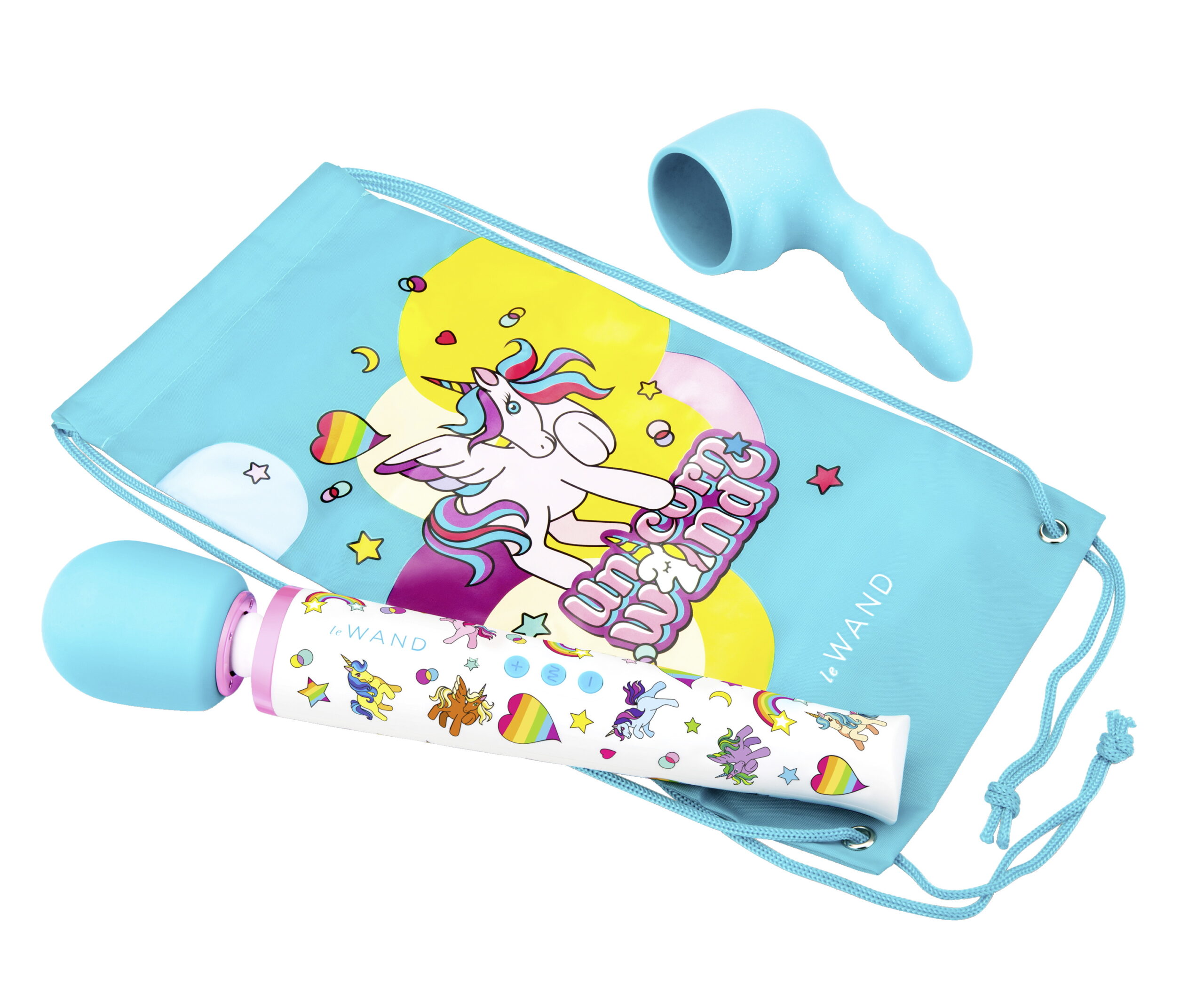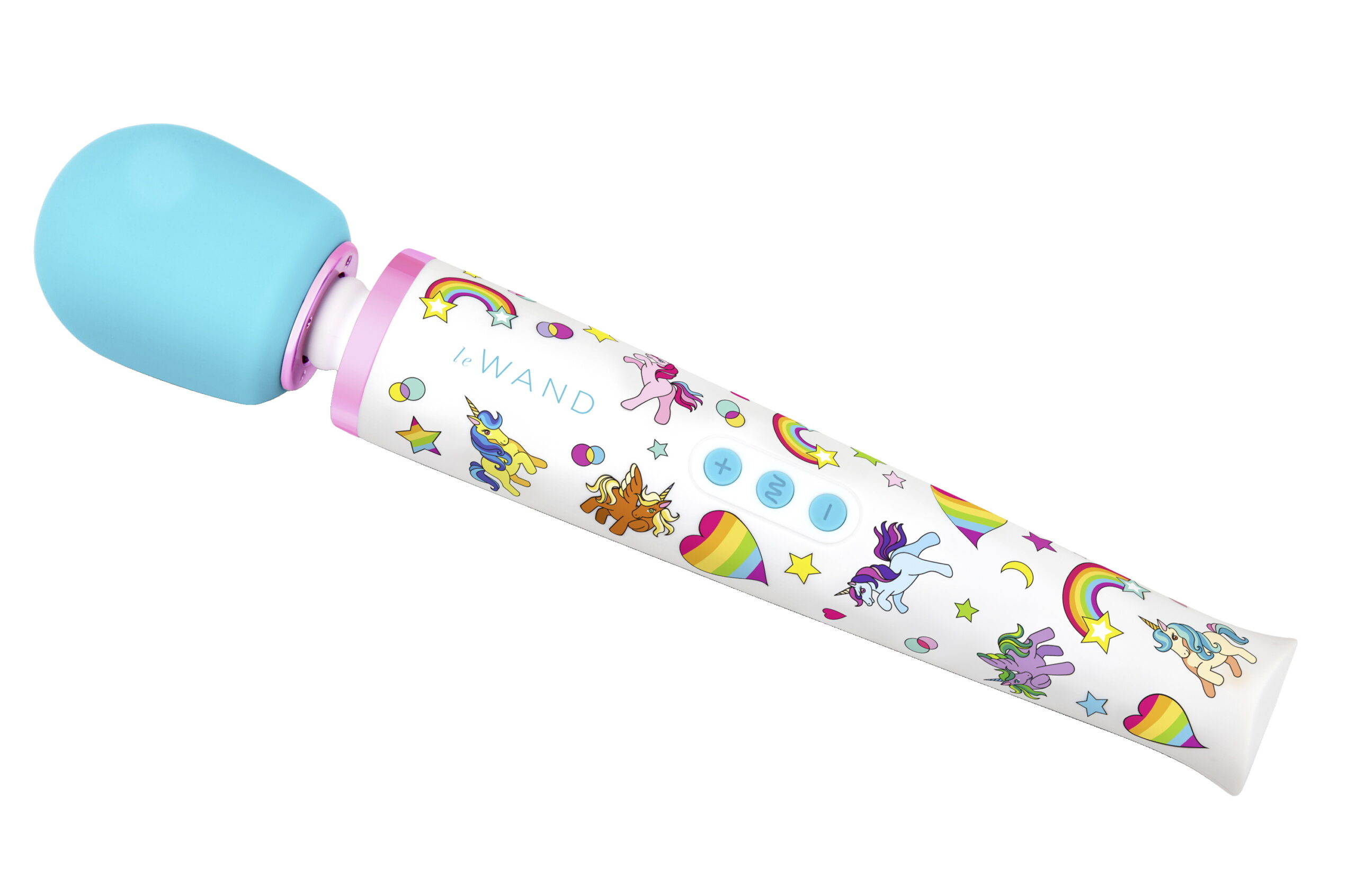 Wiederaufladbarer Luxus-Massagestab Unicorn Wand von Le Wand im Regenbogen-bunten Design. Inklusive Einhorn-Dildoaufsatz und vielen weiteren verspielten Extras für fantasievollen Massagespaß mit magischen Höhepunkten! 20 Vibrationsmodi in 10 Intensitäten sorgen dabei ganz leise (max. 68 dB) für reichlich Abwechslung. Mit der 3-Button-Steuerung am Griff ist alles einfach und bequem steuerbar.